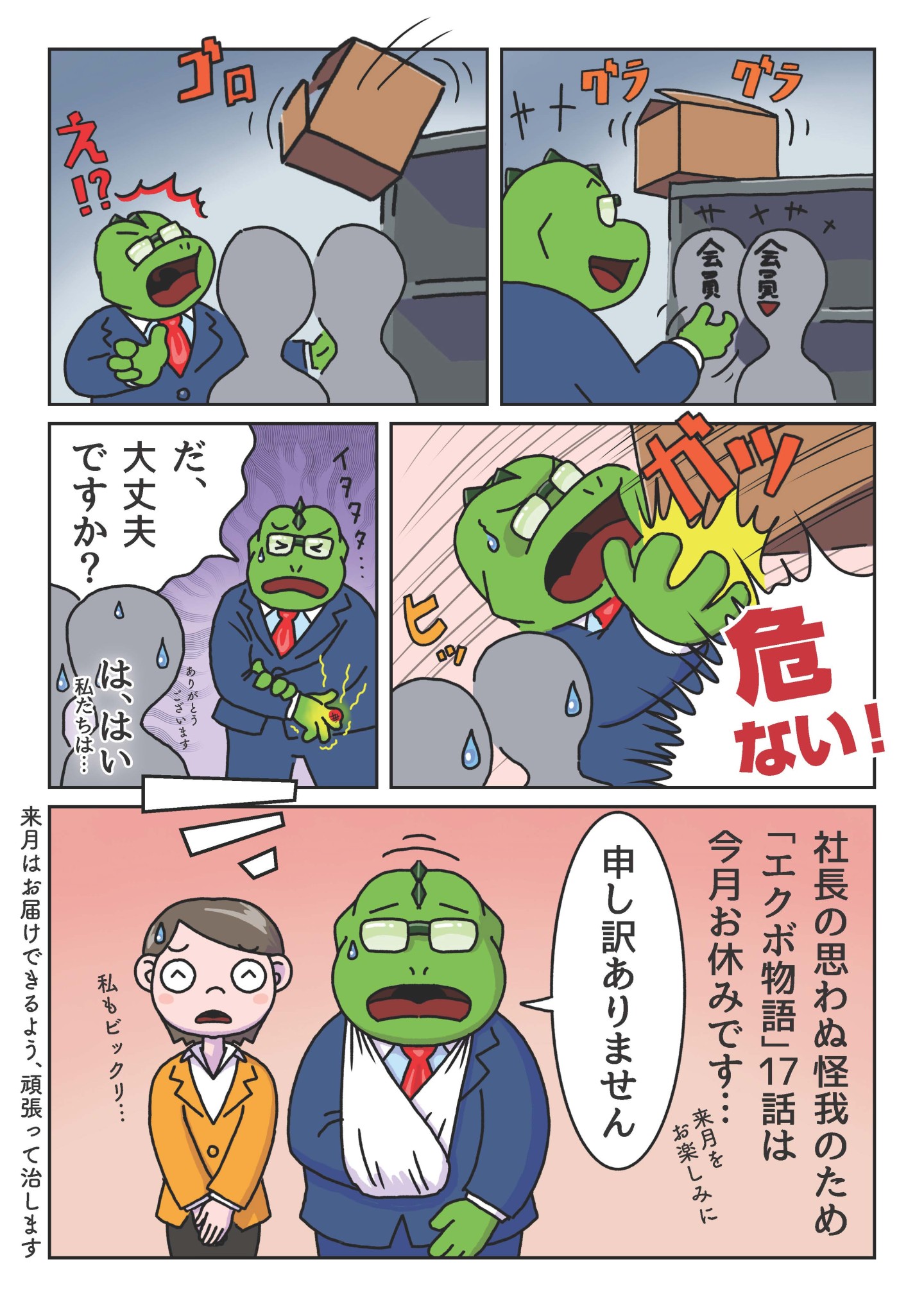 第17回 新エクボ物語休刊のお知らせ 2026.02.04 最終更新日時 : 2026.02.04 administrator 「社長のケガ」 1月の社外イベントでエクボ物語作者の清水が、会員をかばってケガを負ったため、誠に勝手ですが、マンガで辿るエクボ物語「第17回」(2月発行分)を休刊させて頂きます。